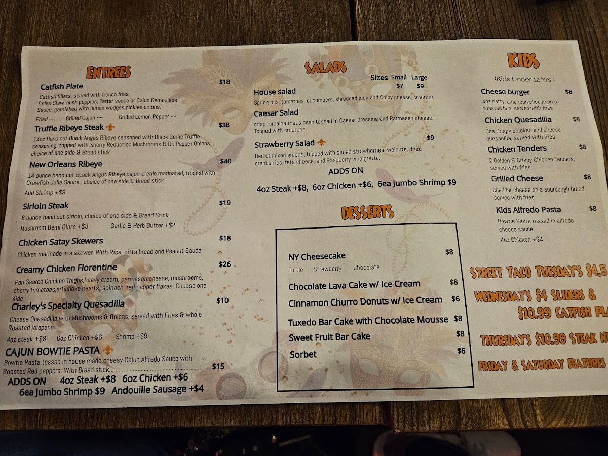 Start your meal with the tantalizing Chicken & Andouille Gumbo for just $6.99, or savor the flavors of the Blackened Caesar Salad with Salmon at $13.99. For a heartier option, the USDA Farm Raised Catfish at $10.99 and the Crawfish Etouffee at $12.99 showcase the restaurant's dedication to authentically delicious dishes.